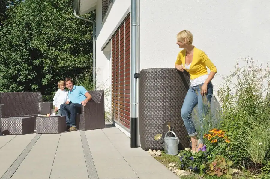 - Depósito decorativo de agua de lluvia con una apariencia de ratán