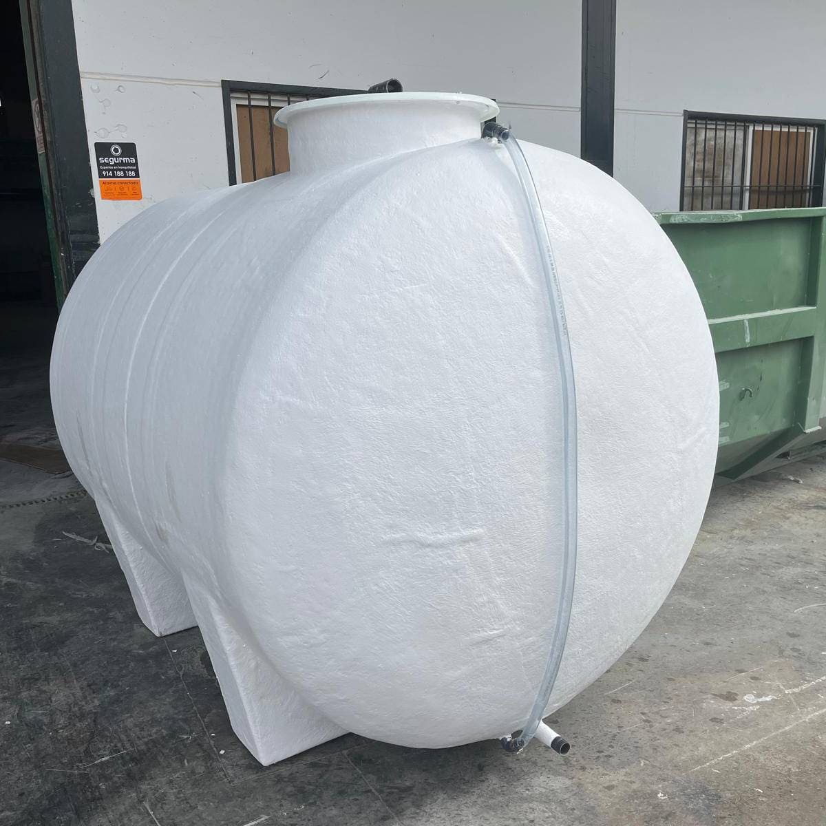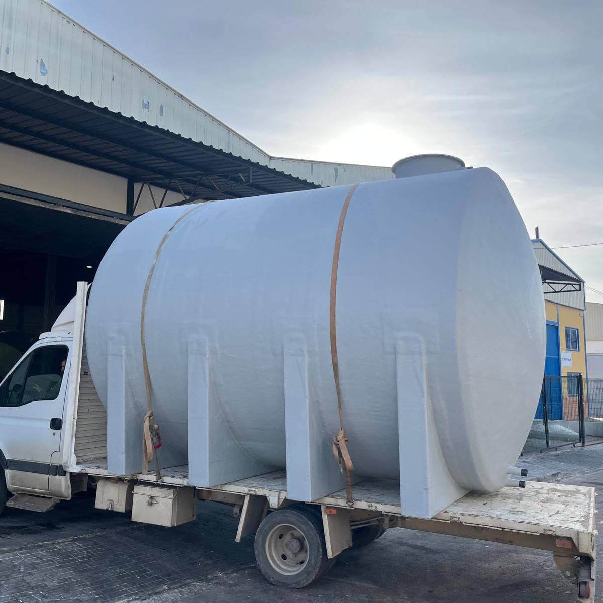 Tanque cilíndrico de eje horizontal sobre patas. Compuesto por dos fondos semi-esferoidales oblato recubiertos por una pared cilíndrica. El encuentro tanto interior como exterior del tramo recto con los fondos se refuerza con dos bandas solapadas por igual en ambas partes. La entrega de este depósito se realiza en un camión pluma o tráiler (en función del tamaño) SIN MEDIOS DE DESCARGA. Dichos medios deben estar previstos por el cliente.